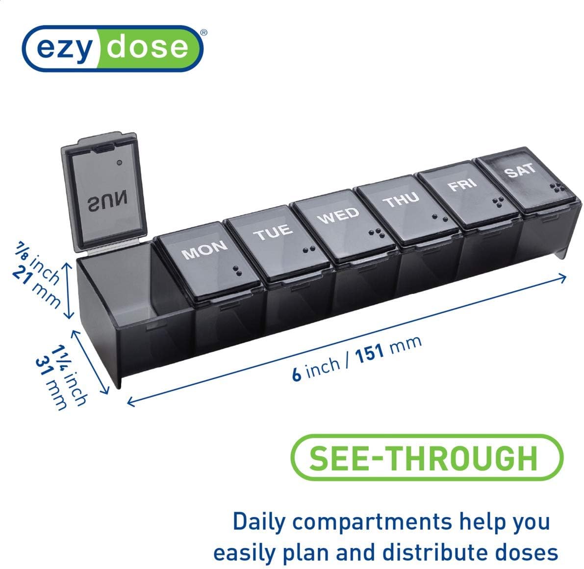 Ezy Dose Classic pill Planner (large) - 7-Day pill reminder - This 1 week pill Organizer is perfect for Scheduling your week's Medication. It has a contoured bottom for easy pill removal. This 7-Day pill Planner is designed for easy use. Its lids open with Little effort and each is clearly marked with each day of the week. The main features of the classic one week pill Planner include: Easy to open - lids pop open with minimal effort. Contoured bottoms - Contoured bottoms allow for easy retrieval of medication. Large compartments - the planner compartments can hold 22 aspirin tablets and have plenty of room for all of your daily medications. About Ezy Dose: Ezy Dose is the leader in easy-to-use medication management products. Many of our push-button pill planners are endorsed by the Arthritis Foundation for our ease-of-use design. Ezy Dose products make living healthier simply easier with products like pill cutters, pill crushers and a full line of easy-fill planners.